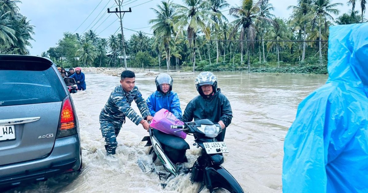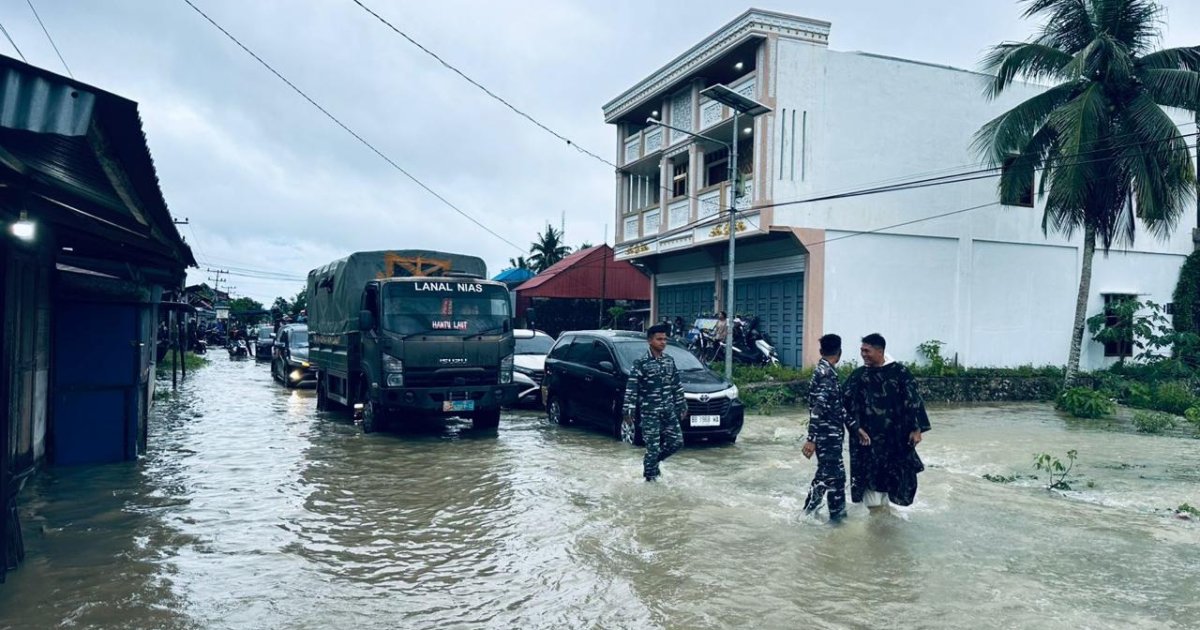 Menyikapi kondisi tersebut, Satgas Penanggulangan Bencana (Gulbencal) Pangkalan TNI Angkatan Laut (Lanal) Nias bergerak cepat melaksanakan aksi tanggap darurat. Dengan mengerahkan truk dinas TNI AL, prajurit Lanal Nias membantu mengevakuasi dan menyeberangkan warga melintasi genangan banjir yang cukup dalam.