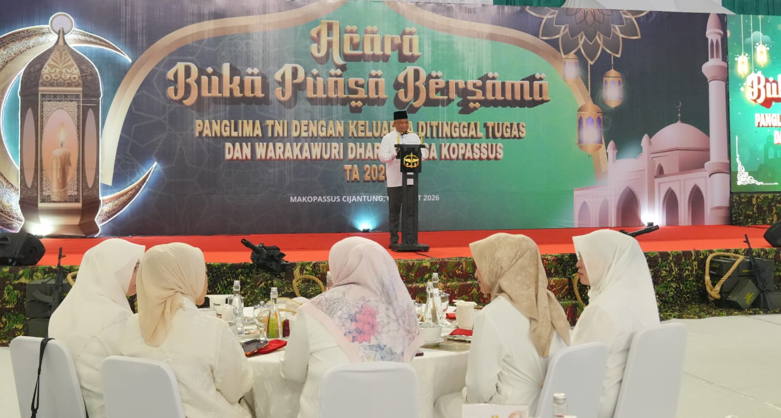 JAKARTA - Panglima TNI Jenderal TNI Agus Subiyanto diwakili oleh Wakil Kepala Staf TNI Angkatan Darat (Wakasad) Letjen TNI Muhammad Saleh Mustafa menghadiri acara Buka Puasa Bersama dengan keluarga prajurit yang ditinggal tugas serta Warakawuri Dharma Nusa Kopassus yang berlangsung di Gedung Nanggala Makopassus, Cijantung, Jakarta Timur, Minggu (8/3/2026).