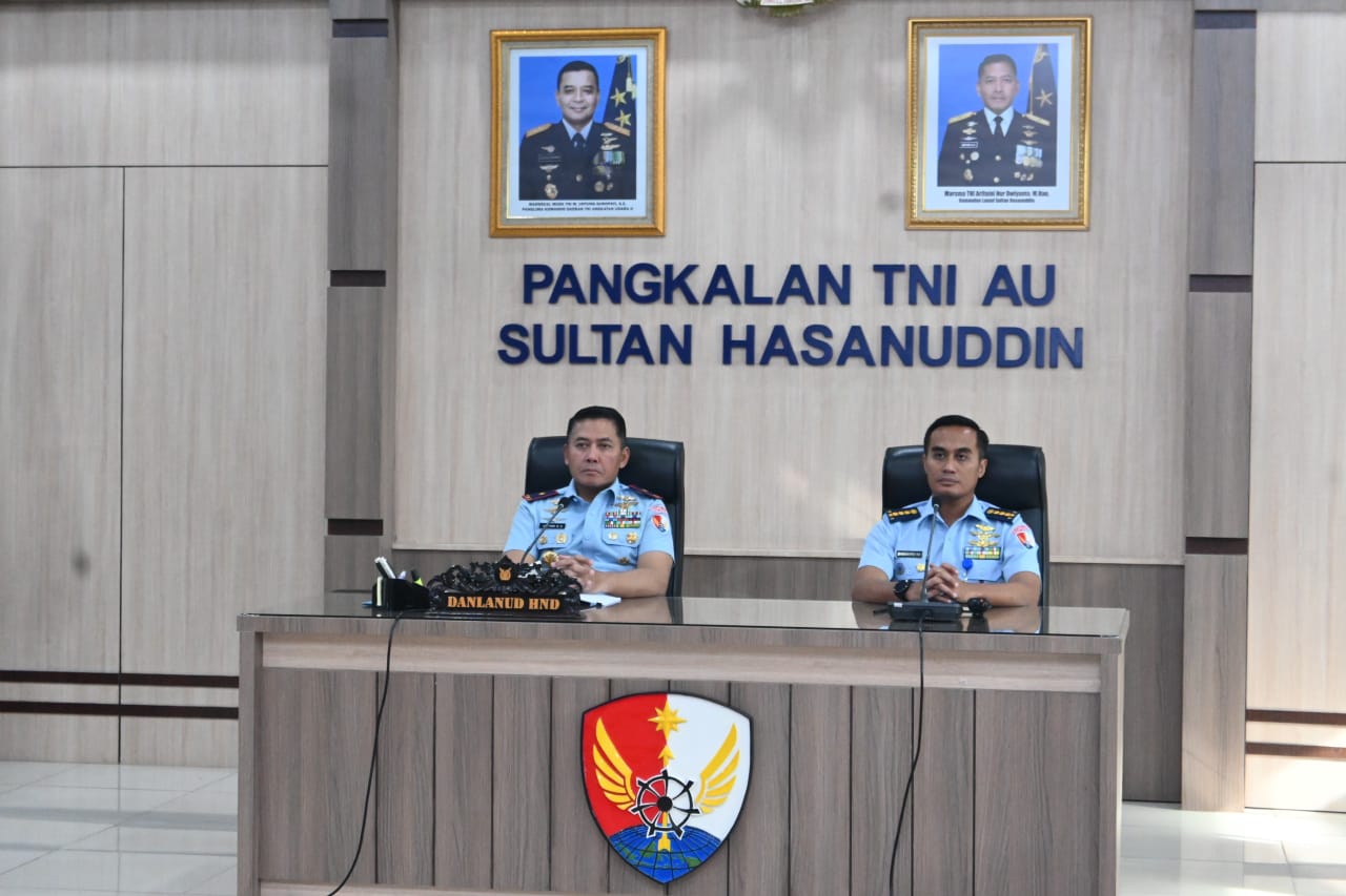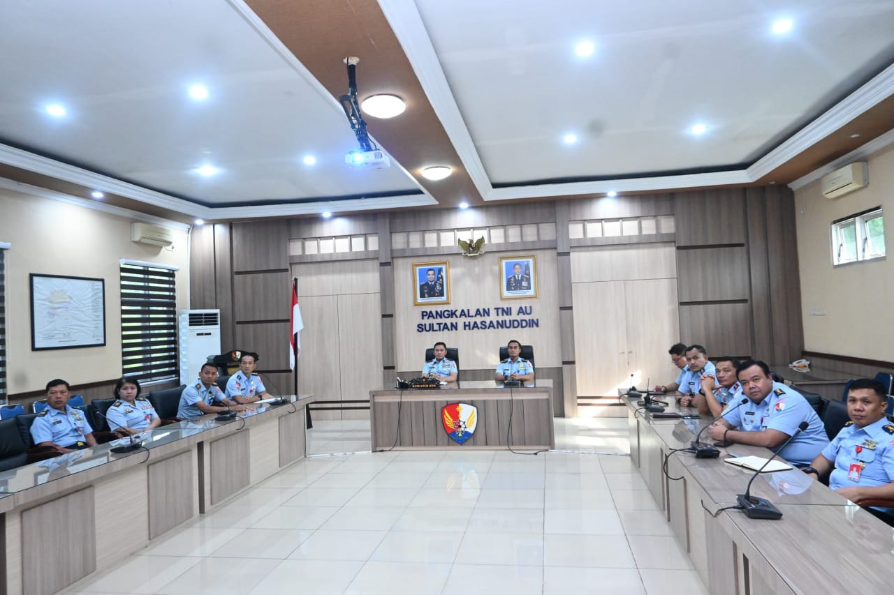 Makassar - Danlanud Sultan Hasanuddin Marsma TNI Arifaini Nur Dwiyanto, M.Han., didampingi para pejabat Lanud Sultan Hasanuddin mengikuti Rapat Kerja Teknis (Rakernis) Komando Daerah TNI Angkatan Udara II (Kodau II) secara virtual di Ruang Rapat Mako Lanud Sultan Hasanuddin, Senin (23/2/2026).