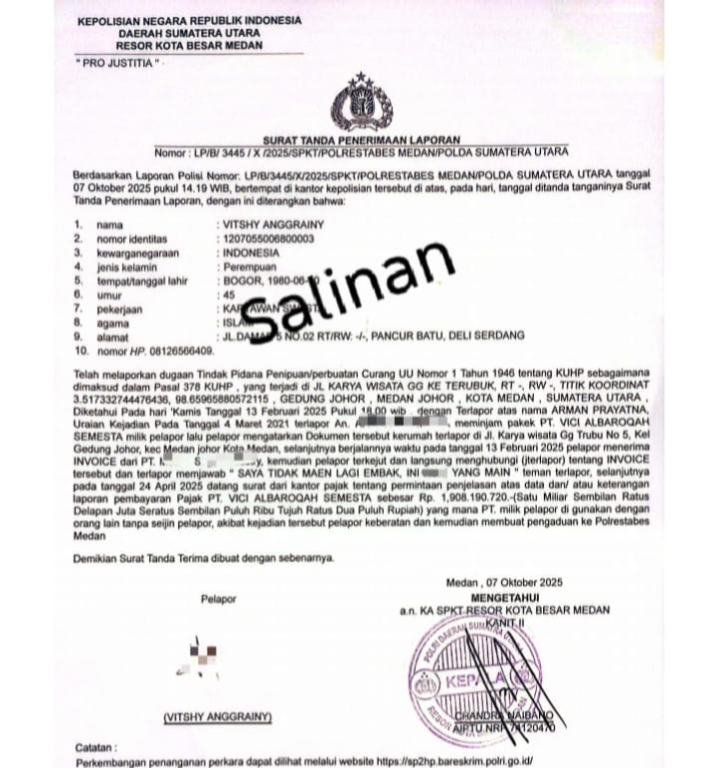 MEDAN, - Sugaan penyalahgunaan identitas badan usaha kembali mencuat di Sumatera Utara. PT Vici Albaroqah Semesta (PT VAS) melaporkan adanya indikasi penggunaan nama dan legalitas perusahaan oleh pihak lain, berujung pada munculnya transaksi dan kewajiban pajak yang tidak diakui oleh perusahaan.