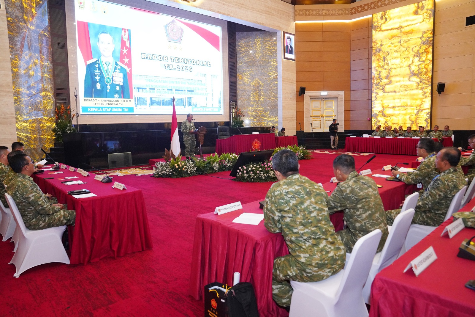 JAKARTA - Kepala Staf Umum (Kasum) TNI Letjen TNI Richard Tampubolon yang diwakili Asisten Teritorial (Aster) Panglima TNI Mayjen TNI Suhardi membuka Rapat Koordinasi Teritorial (Rakor Ter) TNI TA 2026 yang mengusung tema “Penguatan Binter TNI Yang Prima, Mendukung Mewujudkan Asta Cita untuk Indonesia Maju dan Berdaulat", bertempat di Aula Gatot Subroto, Mabes TNI Cilangkap, Jakarta Timur, Kamis (5/3/2026).