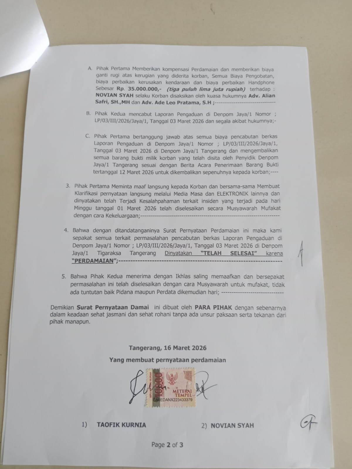 Perdamaian tersebut ditandai dengan pencabutan berkas Laporan Pengaduan di Denpom Jaya/1 Nomor: LP/03/III/ 2026/Jaya/1,Tanggal 03 Maret 2026 di Denpom Jaya/1 Tigaraksa Tangerang .