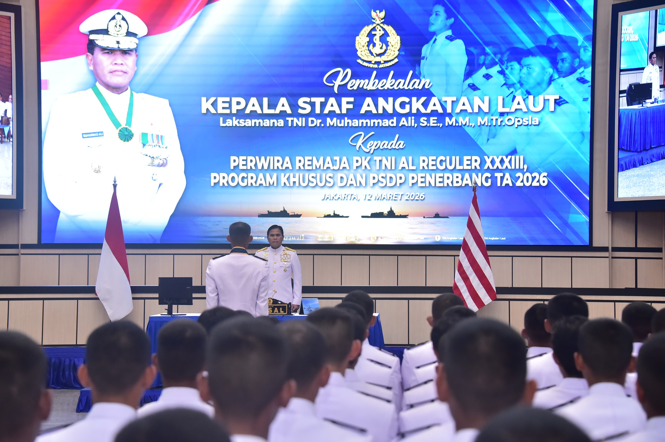 JAKARTA - Kepala Staf Angkatan Laut (Kasal) Laksamana TNI Dr. Muhammad Ali memberikan pengarahan kepada 189 Perwira Remaja lulusan Pendidikan Pertama Perwira Prajurit Karier (PA PK) TNI Reguler dan Program Khusus (Progsus), serta Penerbang Sukarela Dinas Pendek (PSDP) Tahun Anggaran 2026, bertempat Auditorium Denma Mabes TNI AL. Kamis (12/3/2026).