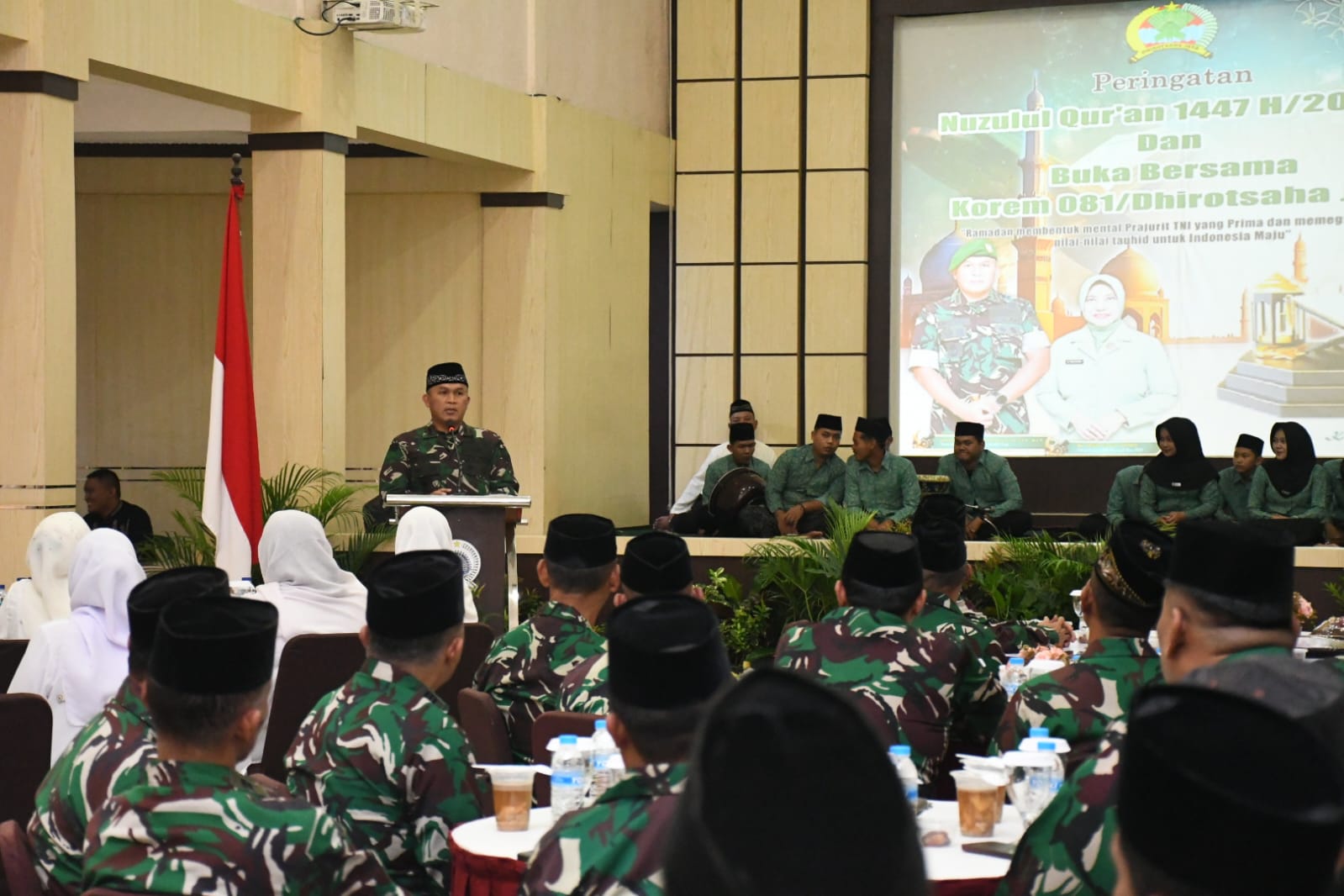 Madiun - Korem 081/DSJ menggelar peringatan Nuzulul Quran dan buka puasa bersama di Aula Jenderal Sudirman, Makorem, Jl. Pahlawan No. 50 Kota Madiun, Kamis (12/3/2026). Selain diikuti oleh personel TNI, ASN, dan Persit dari satuan tersebut, kegiatan itu juga diikuti oleh anak-anak dari Yayasan Panti Asuhan Putra-Putra Pahlawan ABRI Madiun.