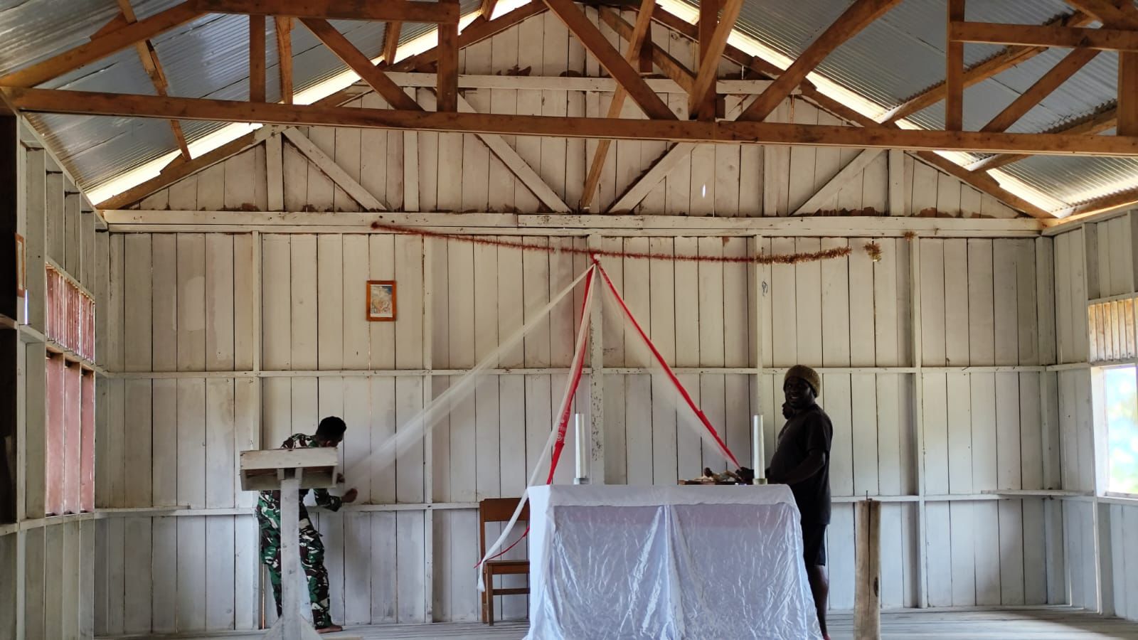 Tarup, Pegunungan Bintang — Pos Tarup Yonif 751/Vira Jaya Sakti (VJS) Satgas Swasembada melaksanakan kegiatan teritorial berupa dekorasi Gereja Katolik Kristus Bangkit dalam rangka menyambut Hari Raya Paskah. Kegiatan ini dilakukan bersama jemaat gereja sebagai wujud kebersamaan, toleransi, dan kepedulian TNI dalam mendukung kekhidmatan ibadah umat Kristiani di wilayah perbatasan. (Sabtu,4/4/2026).
