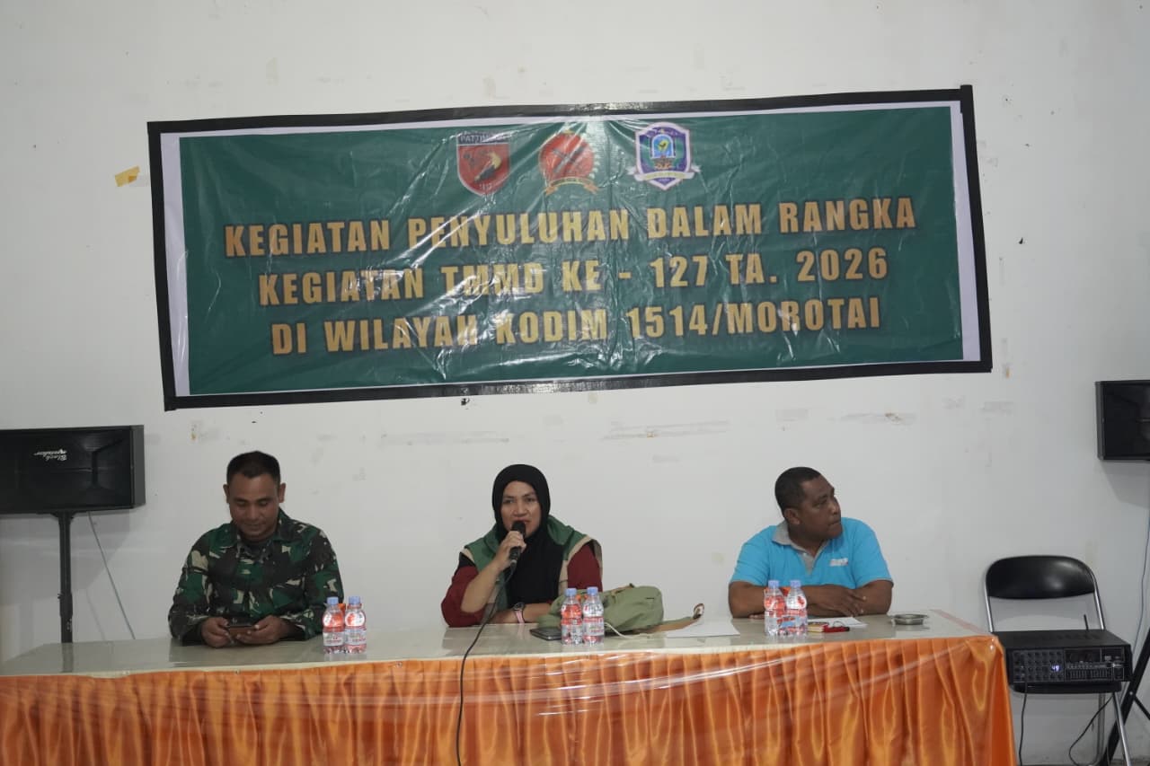 Morotai, Maluku Utara - Satgas TMMD Ke-127 Kodim 1514/Morotai menggelar penyuluhan pencegahan tindak pidana korupsi dan penyuluhan pertanian kepada warga Desa Darame di halaman Kantor Desa Darame, Kecamatan Morotai Selatan, Kamis (26/02/2026). Kegiatan tersebut dihadiri Danramil 1514-02/Bere-Bere Kapten Inf Mustafa Patty, Pasi Intel Kodim 1514/Morotai Letda Inf Visno Bitjoli, Plh Danramil 1514-01/Daruba Serka Firman, Kepala Desa Darame M. Saimad, S.Sos., Jaksa Bidang Intelijen M. Akbar, Koordinator BPP Morotai Selatan Ibu Latifa Djurumudi, S.P., serta masyarakat Desa Darame.