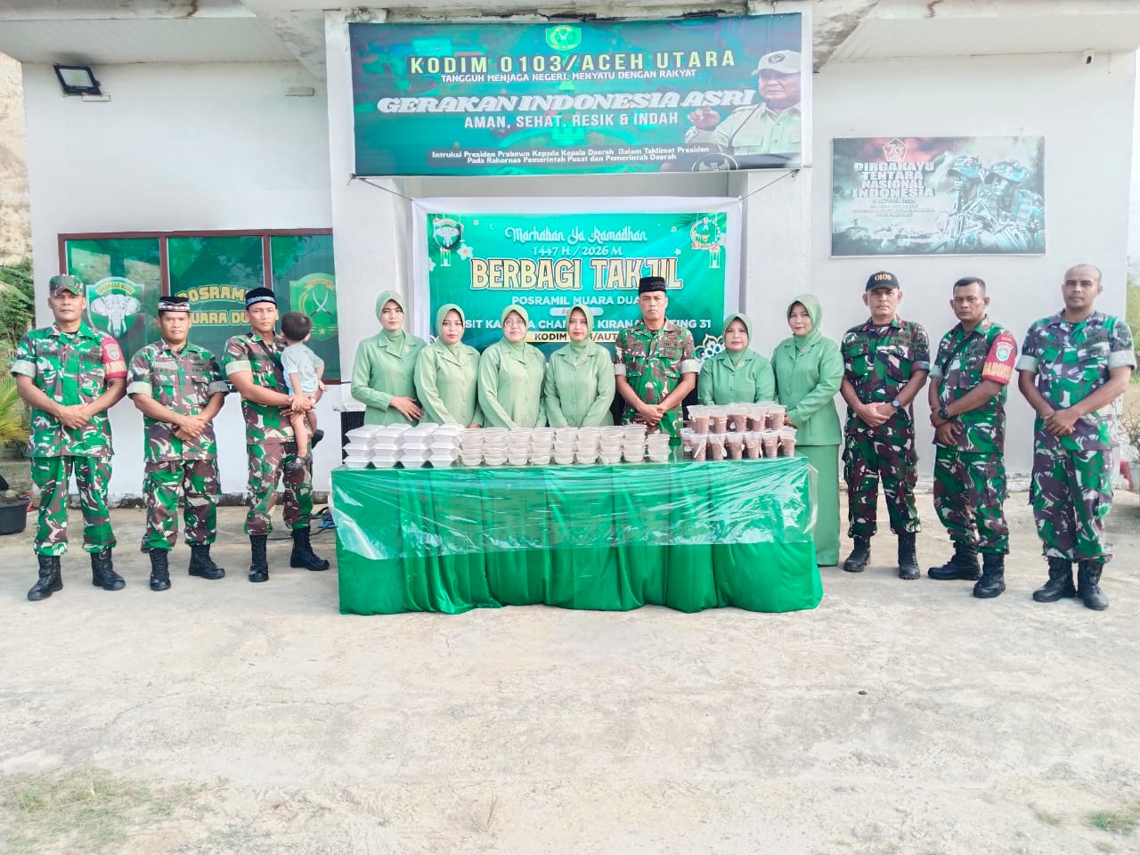 Lhokseumawe - Momentum bulan suci Ramadhan 1447 H dimanfaatkan secara maksimal oleh jajaran Posramil Muara Dua Kodim 0103/Aceh Utara untuk mempererat kemanunggalan TNI dengan rakyat. Dipimpin langsung oleh Danposramil Muara Dua, personel TNI bersama Ibu-ibu Persit Kartika Chandra Kirana (KCK) Ranting 31 menggelar aksi sosial pembagian takjil gratis di wilayah Kecamatan Muara Dua, Kota Lhokseumawe, Kamis (19/3/2026).