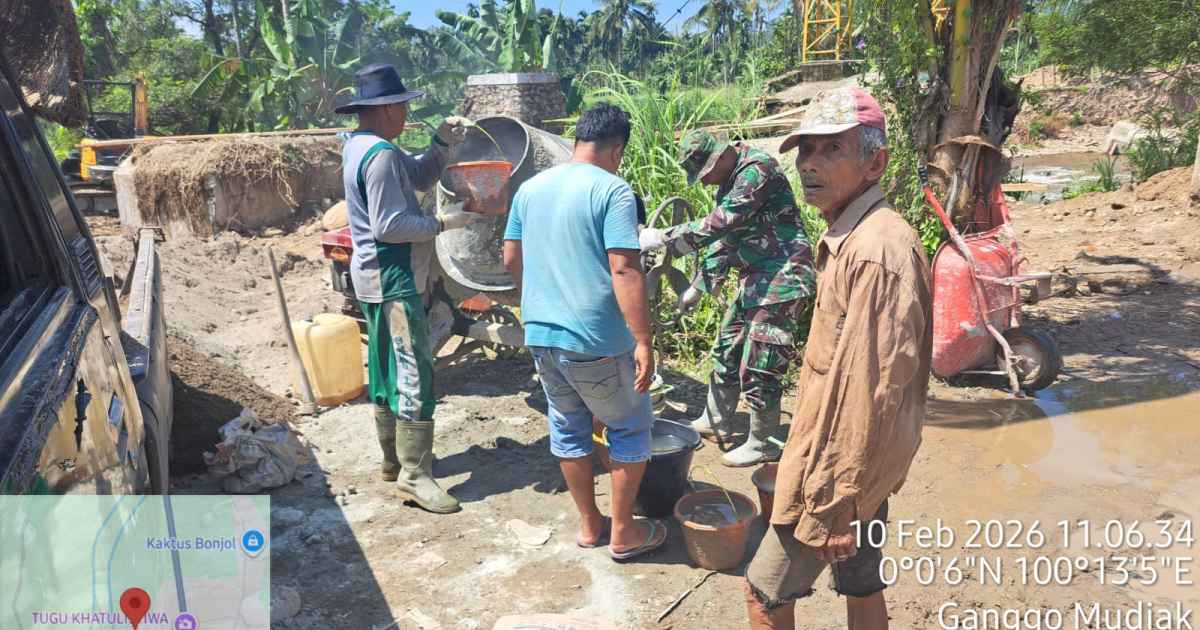 Pasaman - TNI Angkatan Darat melalui Kodim 0305/Pasaman terus memacu pembangunan Jembatan Gantung Equator di Jorong Kampung Alai, Nagari Ganggo Mudik, Kecamatan Bonjol, Kabupaten Pasaman, Sumatera Barat, Selasa (10/2/2026). Pembangunan infrastruktur ini menjadi wujud nyata kemanunggalan TNI AD dengan rakyat dalam mendukung percepatan pembangunan wilayah pedesaan.