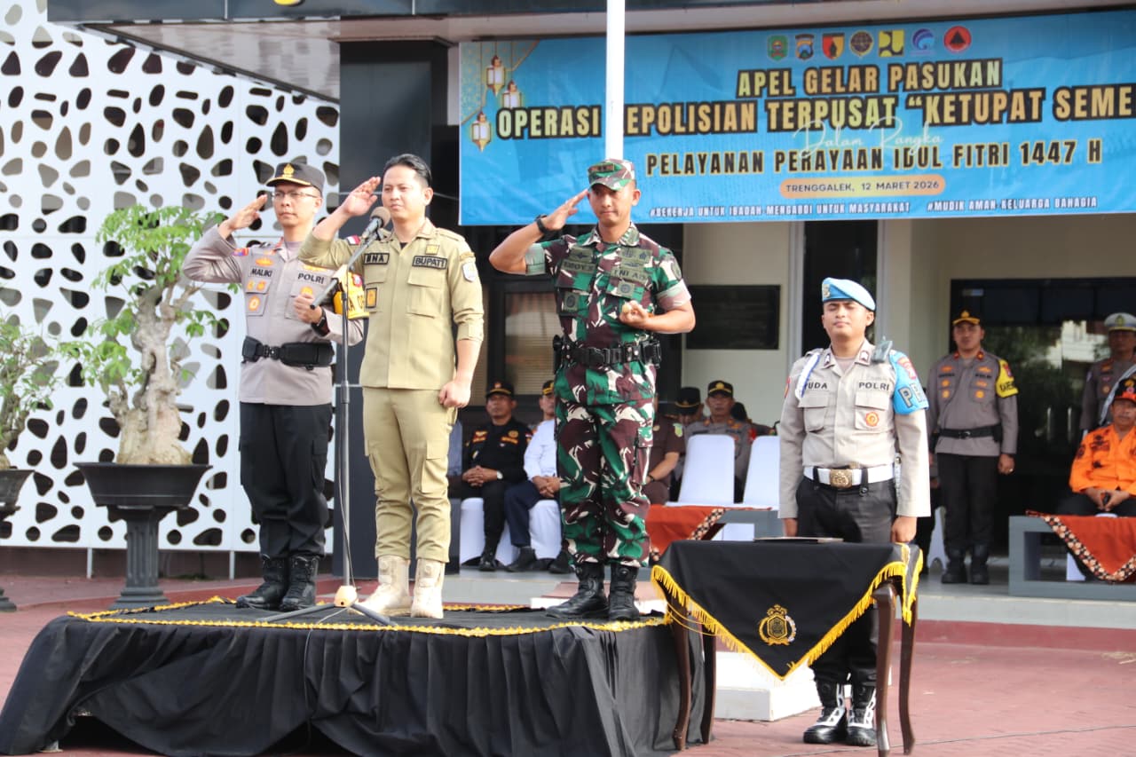 Trenggalek – Komandan Kodim (Dandim) 0806/Trenggalek Isnanto Roy Saputro, S.H., MSi., bersama Bupati Trenggalek Mochamad Nur Arifin dan Kapolres Trenggalek Ridwan Maliki, S.H., S.I.K., M.I.K., bersinergi dalam Apel Gelar Pasukan Operasi Kepolisian Terpusat Operasi Ketupat Semeru 2026 untuk pengamanan dan pelayanan perayaan Idul Fitri 1447 Hijriah di wilayah Kabupaten Trenggalek. Kegiatan tersebut digelar di Markas Polres Trenggalek, Kamis (12/3/2026).
